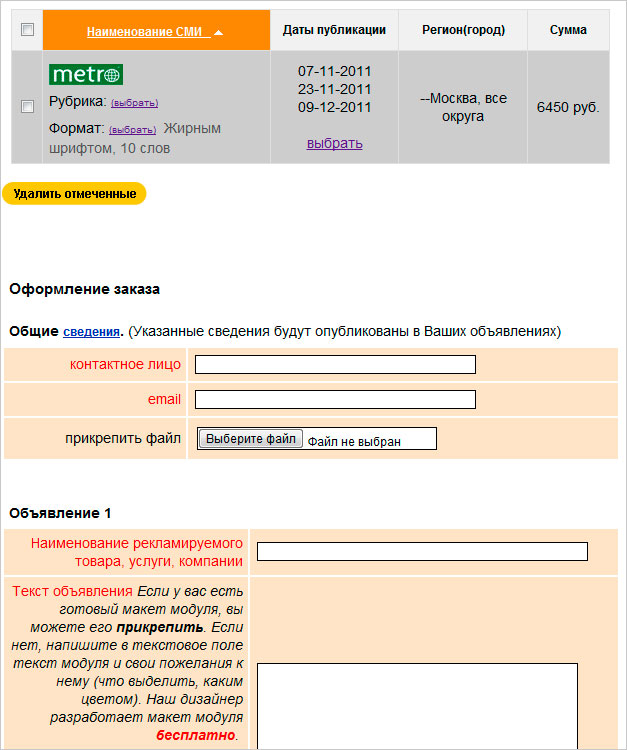 Создание объявления в газету МЕТРО