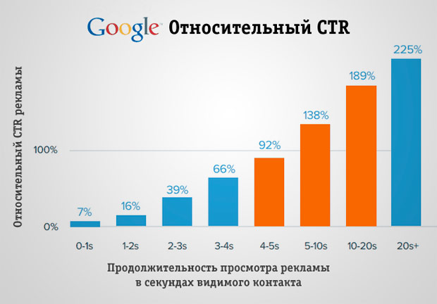 Google в своей статье «The Importance of Being Seen: Viewability and Brands», рассказывая о связи между видимостью и эффективностью рекламы, также указывает на рост CTR при продолжительности зрительного контакта более 5 секунд.