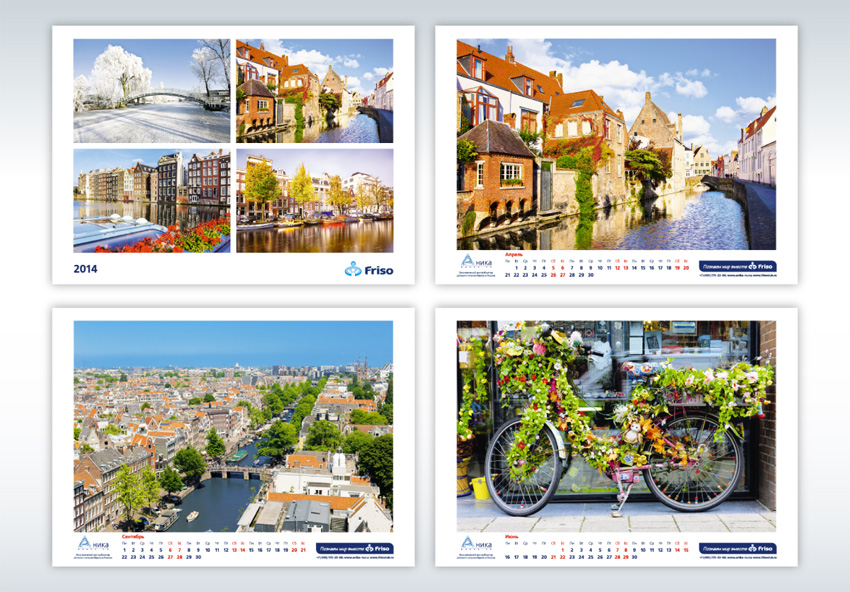 В рамках проекта осуществлена адаптация нового фирменного стиля компании Friso для российского рынка и произведен дизайн календарей:- квартальный