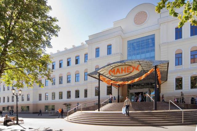 ТЦ "Манеж" открылся в сентябре 2007 года. 3-хэтажный торговый центр площадью более 40000 кв. метров, расположен в центральной части города. В ходе ремонта и реконструкции здания строителям удалось в точности, вплоть до цветовых нюансов, воссоздать архитектурный облик существовавший здесь в XIX веке духовой семинарии, построенной по проекту Дворжецкого и входившей в число достопримечательностей города. ТЦ "Манеж" – место, куда хочется возвращаться снова и снова. Усилиями дизайнеров и администрации в торговом центре создается атмосфера домашнего уюта и праздника. В «Манеже» можно не только походить по магазинам, но и отдохнуть от трудовых будней. Для любителей активного отдыха действует скейтпарк (единственный в городе), площадь которого составляет 646 м2. Практически каждую неделю в торговом центре на сцене развлекательного комплекса «3 UROVEN» звучит «живая музыка» на любой вкус.