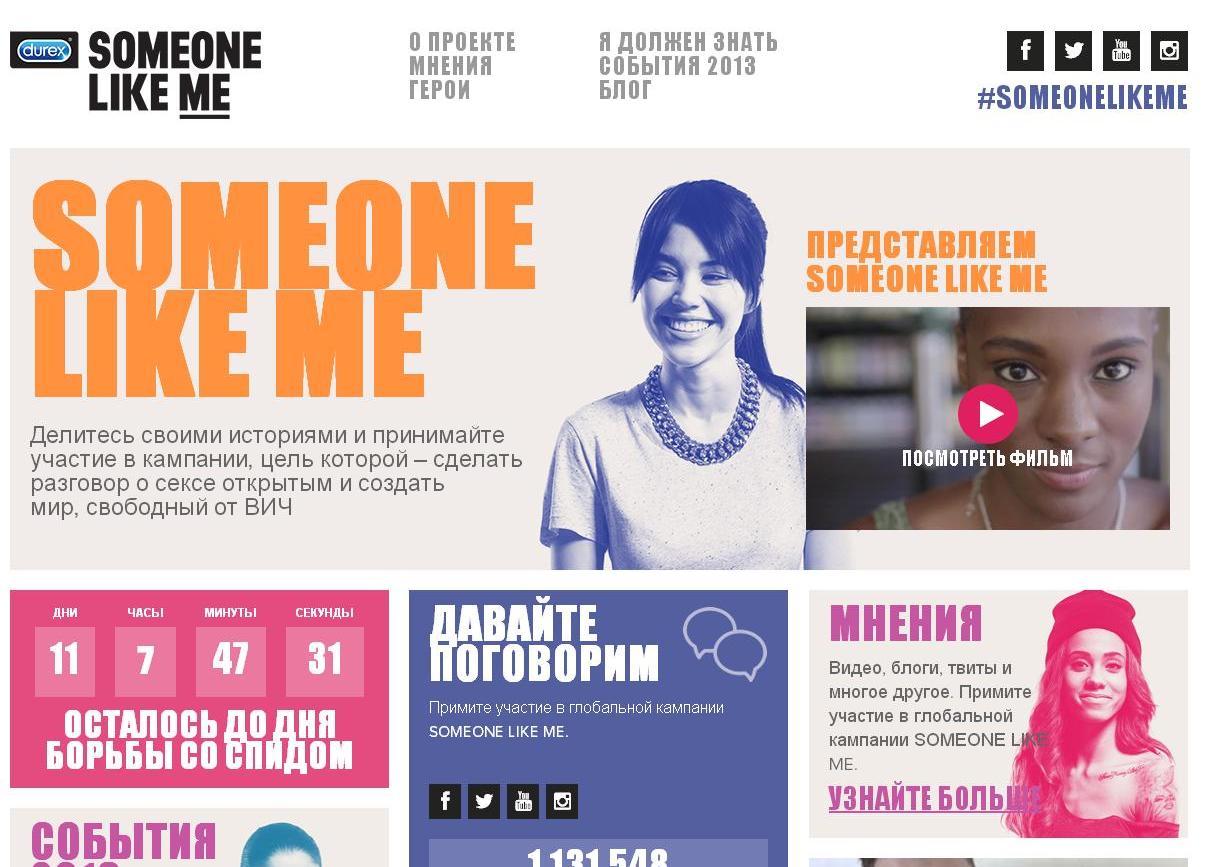 Агентство Progression (Progression group) также запустило активное продвижение проекта Someone Like Me в группе бренда Durex в социальных сетях. Так, например, в группе Durex во “Вконтакте” ежедневно публикуются анонсирующие посты, видео, факты и цитаты с сайта SomeoneLikeMe.tv, которые набирают по несколько тысяч лайков и комментариев. Страница регулярно пополняется видео-дневниками с историями о сексуальных проблемах молодых людей всего мира. Также на сайте любой желающий может задать вопрос и принять участие в беседе, цель которой – сделать разговор о сексе открытым и тем самым создать мир, свободный от ВИЧ.