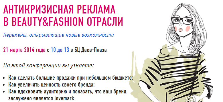 21 марта 2014 года с 10-00 до 13-00 в конференц-зале бизнес-центра «Даев Плаза» пройдёт конференция «АНТИКРИЗИСНАЯ РЕКЛАМА В BEAUTY&FASHIONОТРАСЛИ: перемены, открывающие новые возможности».