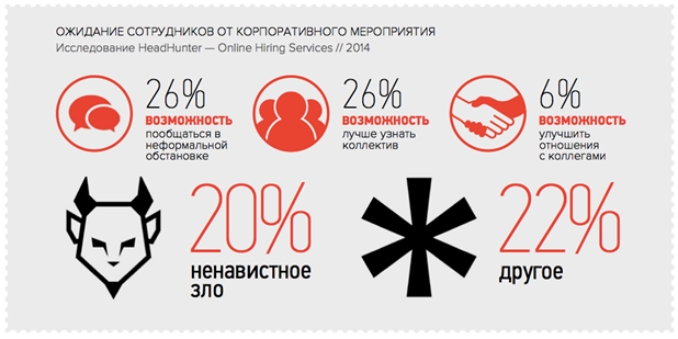 Справка. По данным исследований компании интернет-рекрутмента HeadHunter 2014 года ожидания сотрудников от корпоративного мероприятия распределяются следующим образом: