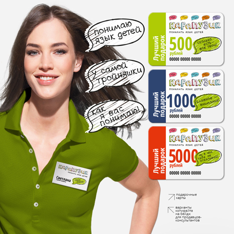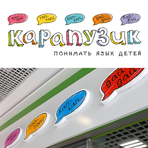 Так появилась яркая, свежая и современная айдентика сети «Карапузик», которая позволила сформировать кардинально новый уровень потребительского восприятия марки. Акцент был сделан на эмоциональных бенефитах, которые нашли отражение не только в визуальной концепции бренда, но и во всем оформлении торгового пространства. За счет работающей системы коммуникации («говорящих» символов, пиктограмм, цветового кодирования, изображений и фото) был создан образ дружелюбного, вызывающего к себе доверие детского магазина, который в доступной игровой форме учит покупателей понимать детей, их язык и потребности.