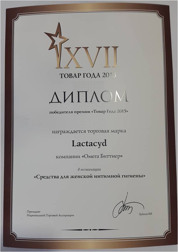 В скором времени, символ премии «Товар Года» – легендарная золотая звезда – появится на упаковках бренда «Lactacyd». Эмблема известна потребителю и вызывает доверие к бренду, помогает выделиться на полках магазинов и определиться с решением о покупке. По данным исследовательских компаний, товары с эмблемой «Товар Года» продаются на 38% лучше, чем остальные конкуренты в категории.«Победа «Lactacyd» в соответствующей номинации свидетельствует об абсолютном признании со стороны потребителей, о правильной маркетинговой стратегии и качественном продвижении. «Lactacyd» не на словах, а на деле является признанным лидером потребительского рынка», — комментирует Юлия Долгова, бренд-менеджер Lactacyd/Innoxa. Трансляцию вручения премии можно будет посмотреть 27 ноября в 22.30 на канале Муз-ТВ.