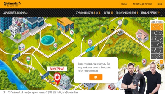 Для обучения сотрудников была разработана платформа с тематической игрой. Участникам предстояло увлекательное цифровое путешествие по России с целью проверки шинных центров CONTINENTAL. По ходу игры им встречались различные сложности, с которыми обычно сталкиваются автомобилисты: переправа, крутой поворот, эстакада, пост ГАИ, нехватка бензина и прочее. Для прохождения препятствий требовалось правильно ответить на каверзные вопросы, предварительно ознакомившись с обучающими материалами на сайте.