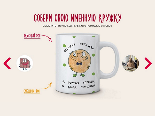 Высокой вовлечённости аудитории удалось добиться с помощью креативного дизайна кружек и элемента индивидуальности: для создания собственной кружки на сайте акции можно замиксовать 6 смешных и 6 вкусных фонов, более 14 фраз (конечно, про чай с печеньками!) и добавить своё имя.