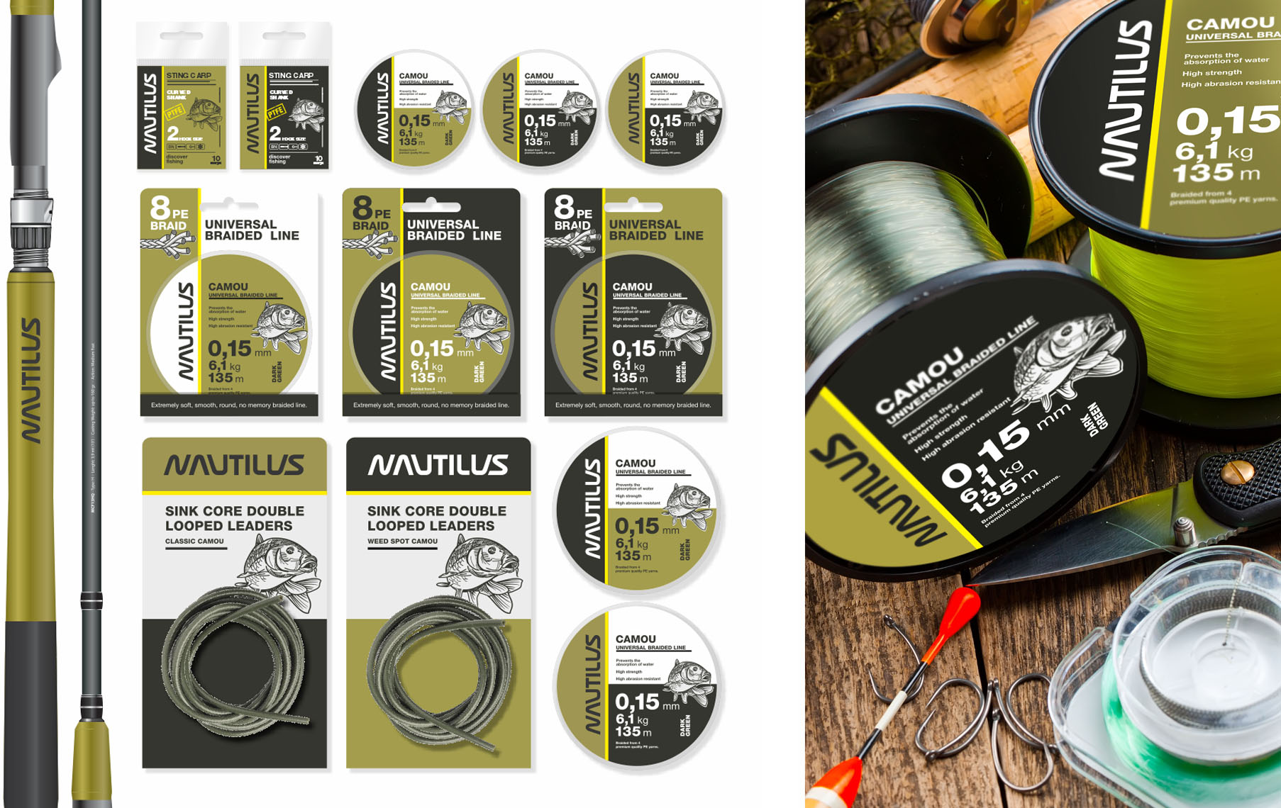 Чтобы потенциальный покупатель легко ориентировался в товарных линейках, в дизайн упаковки были введены дополнительные цвета и графические элементы, которые иллюстрируют различные виды рыбной ловли: со спиннингом, карповой, фидерной ловли и зимней рыбалки.
