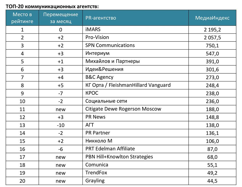 iMARS заняла первую строчку медиарейтинга PR-агентств за август 2019 года