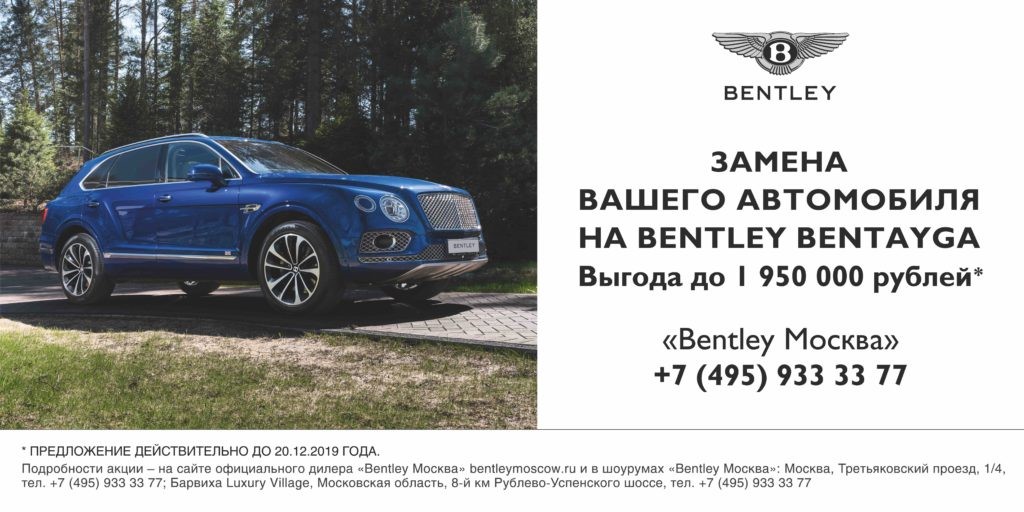 Данная акция действует только до 20 декабря 2019 года и каждый желающий может стать владельцем нового Bentley Bentayga на особых условиях, обменяв свой автомобиль по программе трейд-ин.