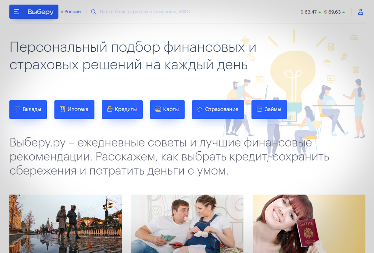 «Сейчас мы обновляем каждый раздел. Первой стала страница «Кредиты». Посетитель заходит в раздел и встречается с калькулятором кредитов и подбором готовых решений. Страница отвечает на популярные и насущные запросы пользователя: рефинансирование, кредиты наличными и под залог недвижимости, без справок и поручителей, программы ведущих банков и даже для клиентов с плохой кредитной историей», — комментирует директор по продукту «Выберу.ру» Юлия Деньгина.
