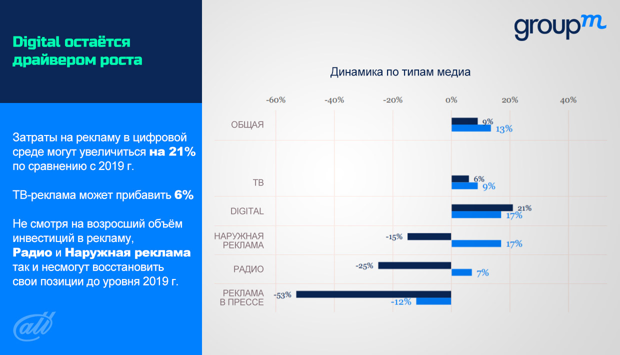 Основным драйвером роста остаётся Digital-сфера. Эксперты ожидают, что расходы на рекламу и маркетинг в цифровой среде вырастут за 2021 год на 21%.