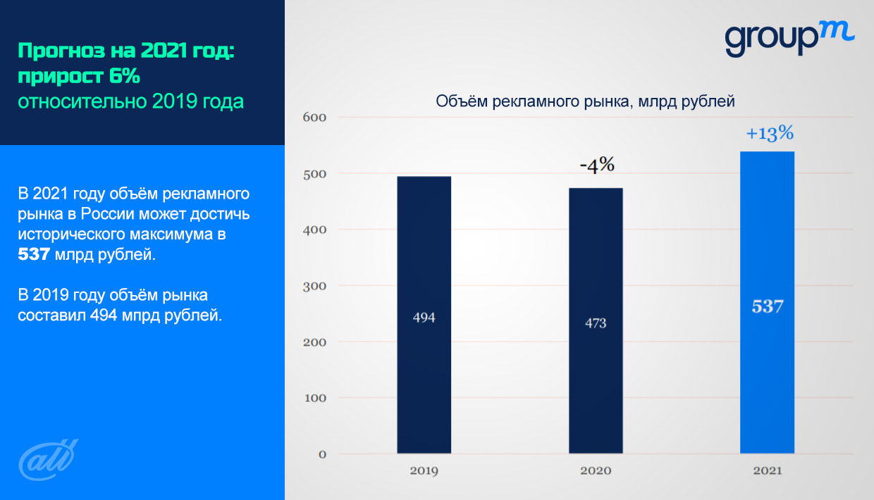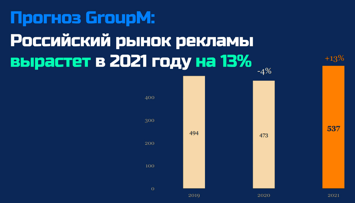 Мария представила прогноз развития российского рекламного рынка в 2021 году:«С учетом текущего прогноза Минэкономразвития по росту ВВП, мы ожидаем, что рекламный рынок будет способен вырасти на 13%.