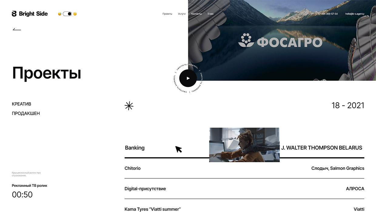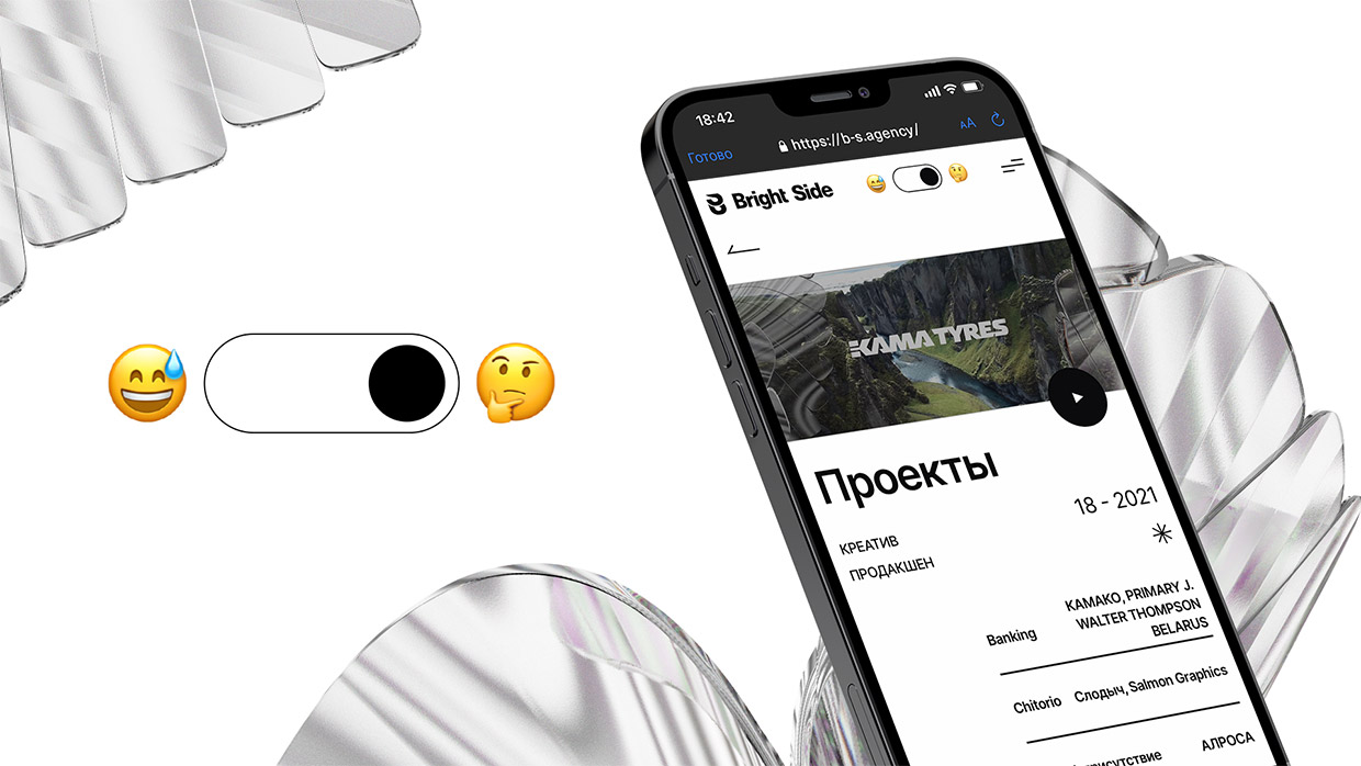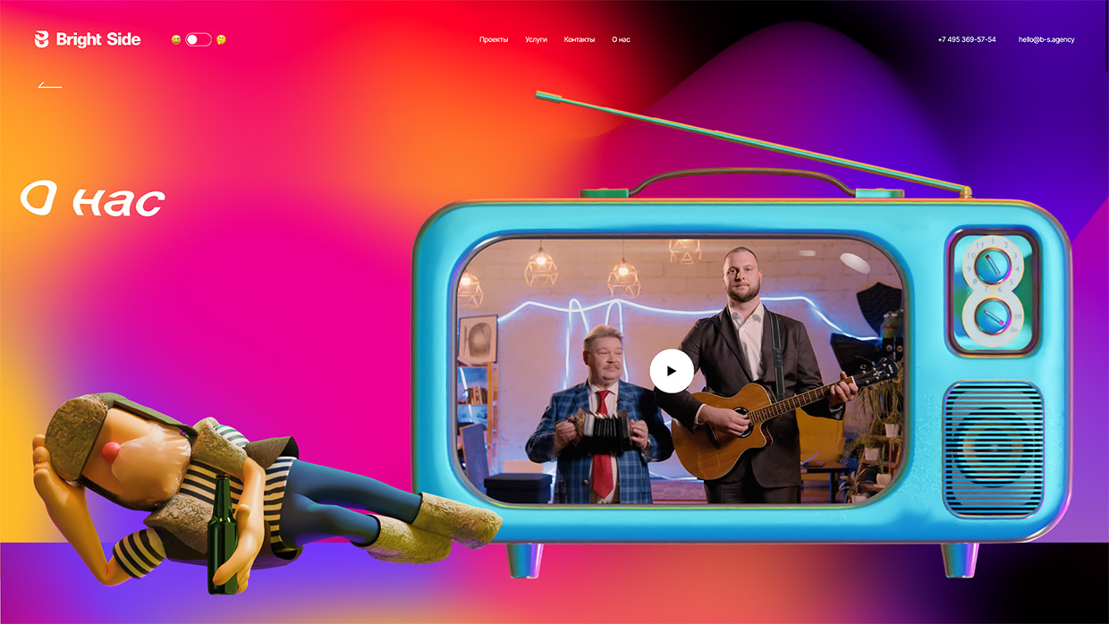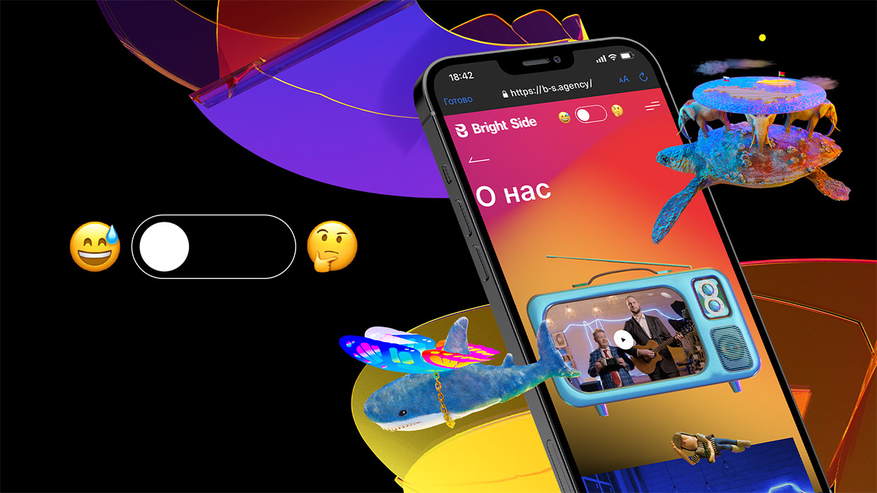 Особой задачей стал новый сайт Bright Side — это два сайта в одном. С помощью кнопки “Сделать веселее/Сделать серьезнее” посетитель может переключаться между версиями сайта на любой странице.