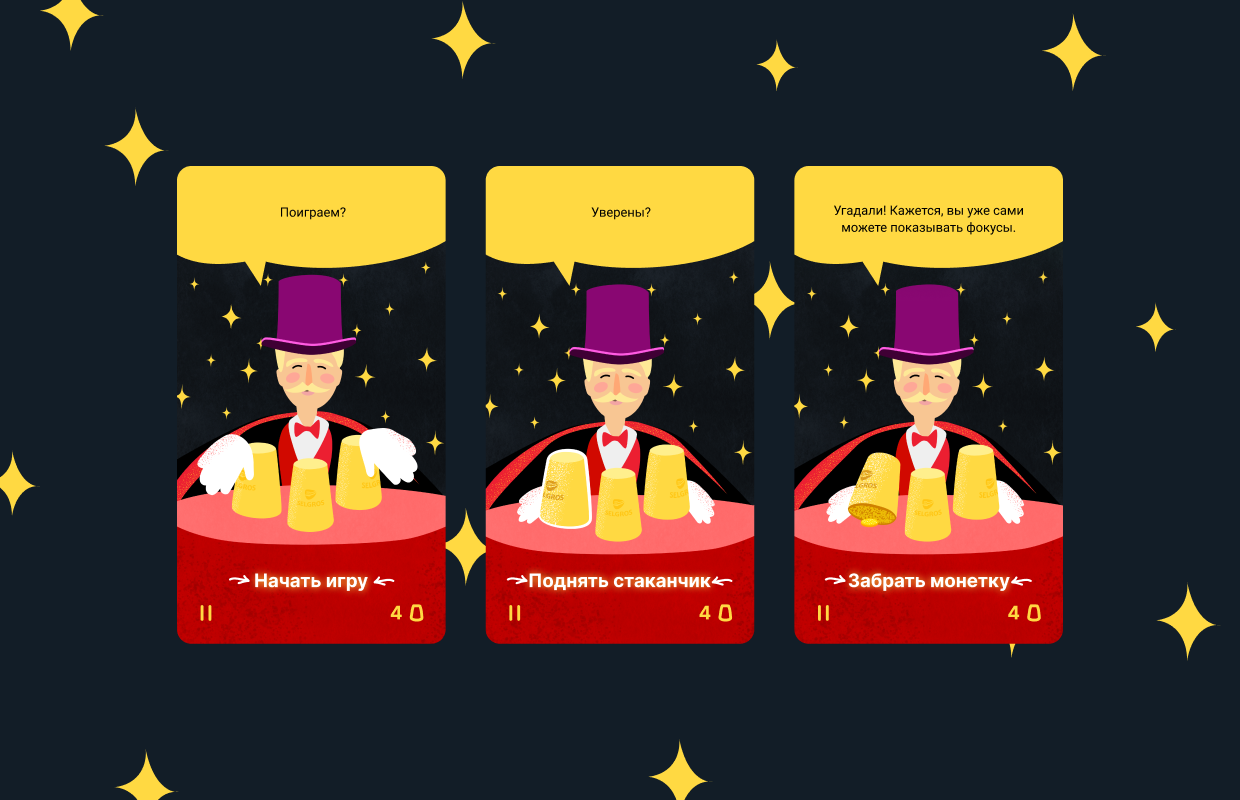 Нам было важно сохранить фестивальный дух, поэтому на SelgrosFest есть классический фокусник со стаканчиками — эти стаканчики и выполняют функцию лутбоксов в игре.
