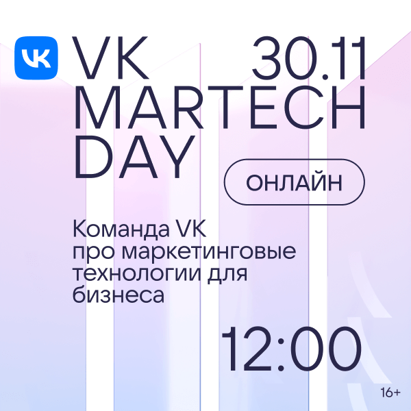 30 ноября в 12:00 на VK MarTech Day эксперты из VK расскажут, какие маркетинговые решения помогут бизнесу расти, как гибко реагировать на изменения рынка и какие инструменты использовать для максимального результата.