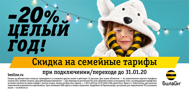 С новогодней акцией «Билайн» праздник будет длиться весь год. Телеоператор дарит всем абонентам подарок — скидку 20% на новые семейные тарифы на 2020 год.
