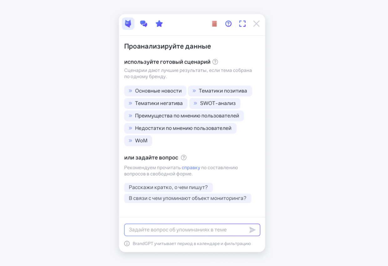ИИ-ассистент умеет анализировать не только прошлое, но и настоящее — актуальное информационное поле вокруг вашего бренда, продукта или другого объекта анализа.