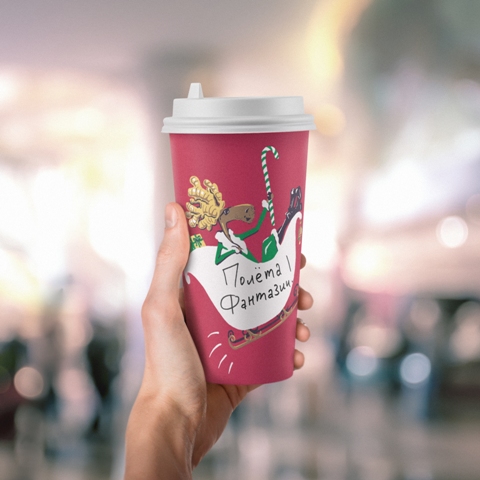 Фишкой стаканов в этом году стало белое поле для новогодних пожеланий, которые пишут для посетителей баристы. Этим пространством служат предметы, участвующие в сюжете: сани, коробка с подарком и сноуборд.