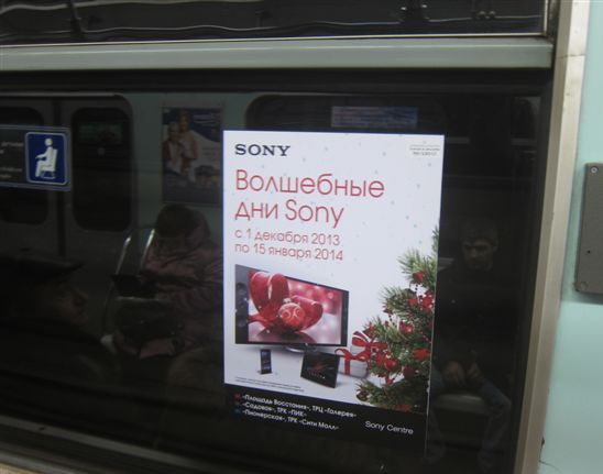 Накануне новогодних праздников для посетителей Sony Centre проводится акция «Волшебные дни в Sony». Всех покупателей ждут подарки и скидки. В качестве рекламных средств были выбраны двухсторонние стикеры на дверях вагонов московского метрополитена, которые являются самыми востребованными носителями под сезонные акции в столице и двухсторонние стикеры на окнах в питерском метро. Также в Санкт-Петербурге были задействованы щиты 3*6.