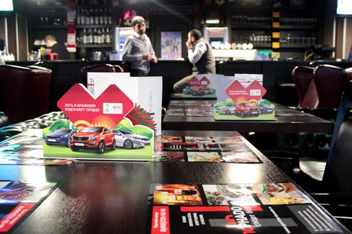 На всех столах 12 спортбаров «Торнадо» будут расположены нестандартные брендированные тейблтенты KIA Motors. Их особенность в необычном формате, индивидуально разработанном для автомобильного бренда.