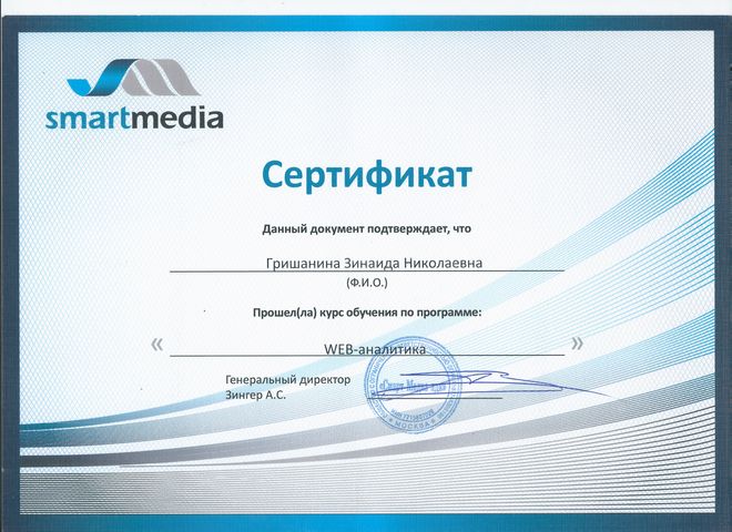 Зинаида Гришанина окончила Сибирский Университет Потребительской Кооперации по специальности «Реклама» в 2007 году. К команде SmartMedia присоединилась в 2011 году в качестве SEO-копирайтера, в 2013 году выросла по карьерной лестнице до SEO-аналитика, в 2014 стала сертифицированным веб-аналитиком. Работала с такими крупными клиентами, как: ОН КЛИНИК, НИАРМЕДИК, Элькар и другими.