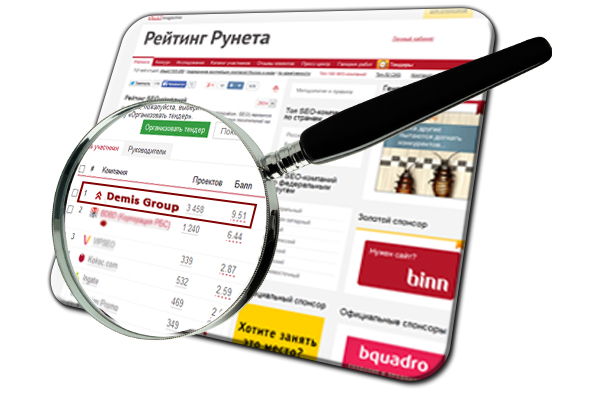 1 место в «Рейтинге Рунета» заняла компания Demis Group, которая вот уже на протяжении 6 лет подряд подтверждает свое беспрекословное лидерство в отрасли, значительно опережая остальных участников рейтинга, превосходя показатели ближайшего конкурента в полтора раза.