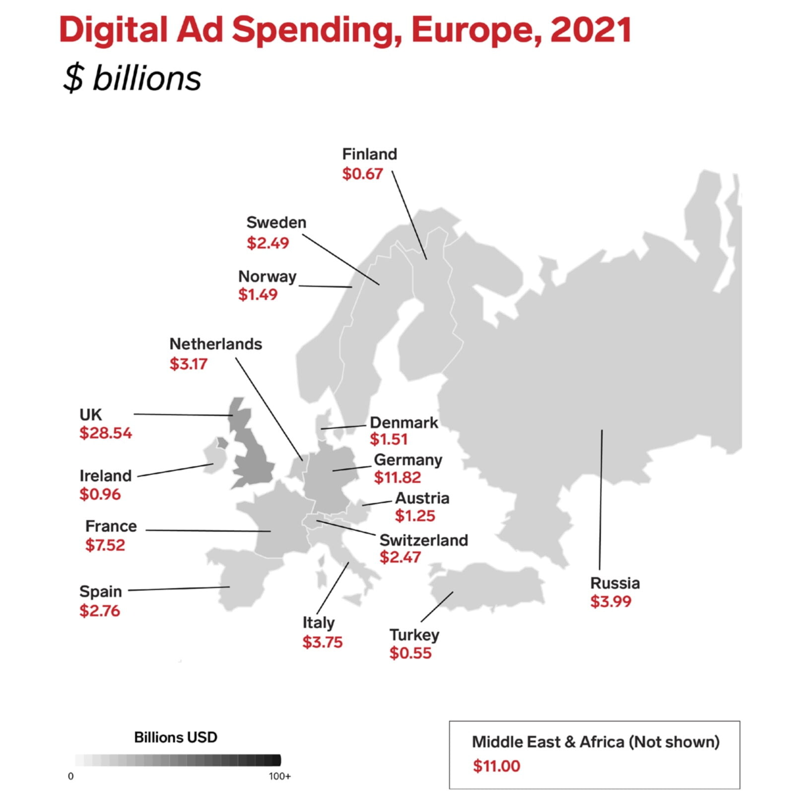 Если сравнивать со странами Европы, российский рынок занимает четвертую строчку по объемам рынка цифровой рекламы. В лидерах Великобритания — $28,5 млрд, Германия — $11,8 млрд и Франция — $7,5 млрд. Замыкает NJG-5 Италия, где на рекламу в диджитал потратили $3,7 млрд.