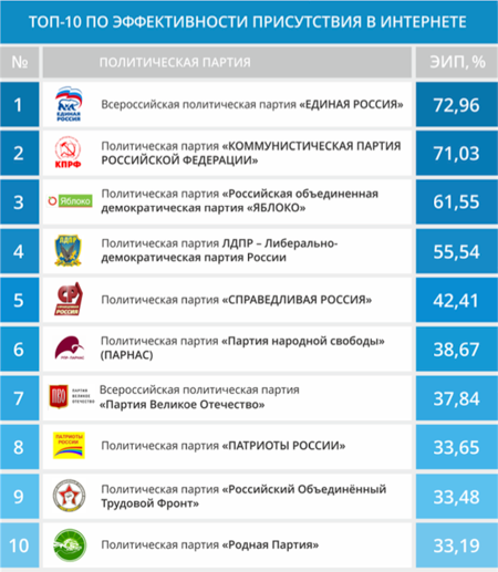 «Приближение сентябрьских выборов подталкивает партии более внимательно подходить к коммуникациям с избирателями в новых медиа. В итоге поменялась тройка лидеров. Первое место, благодаря увеличению активности пользователей в соцсетях, отвоевала «Единая Россия». КПРФ опустилась на второе место. На третье место поднялась партия «Яблоко», а ЛДПР потеряла место в тройке», – отмечает генеральный директор «Гуров и партнеры» Филипп Гуров. По итогам исследования, средний показатель ЭИП для партий, присутствующих в Сети, составляет 21,46%. Показатель незначительно вырос по сравнению с прошлым рейтингом. В то же время, многие партии не проявляют активность в социальных сетях, а у восемнадцати – отсутствуют собственные сайты.