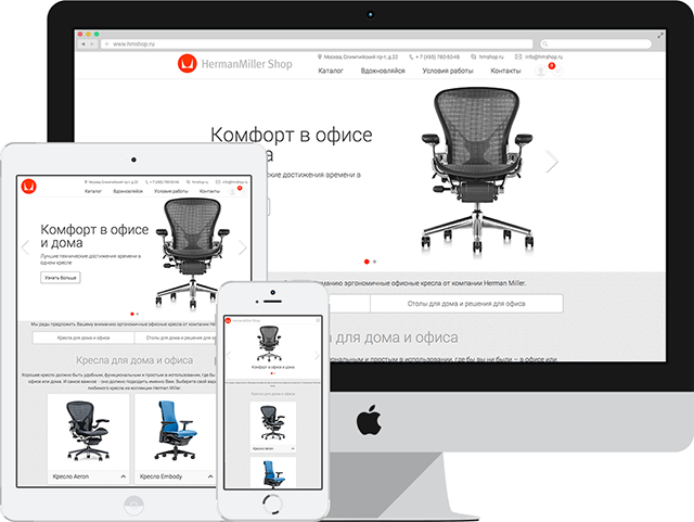 HermanMiller – знаменитый на весь мир бренд со 100-летней историей. Эргономичные кресла и столы занимают свои места в кабинетах руководителей и первых лиц многих компаний в самых разных отраслях. HermanMiller реализует продукцию высокого ценового сегмента – это эксклюзивная, дорогая мебель. Было важно создать с одной стороны презентабельный, а с другой, очень простой интернет-магазин: он должен позволять оформить покупку буквально в два клика – без длительных регистраций и заполнения множества полей.