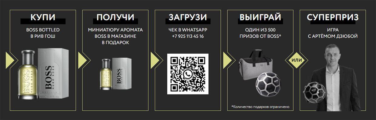 Встретиться с Дзюбой и получить от него пас на футбольном поле могут покупатели «Рив Гош», которые до 30 июня приобретут аромат BOSS Bottled и зарегистрируют чек на промо-сайте.