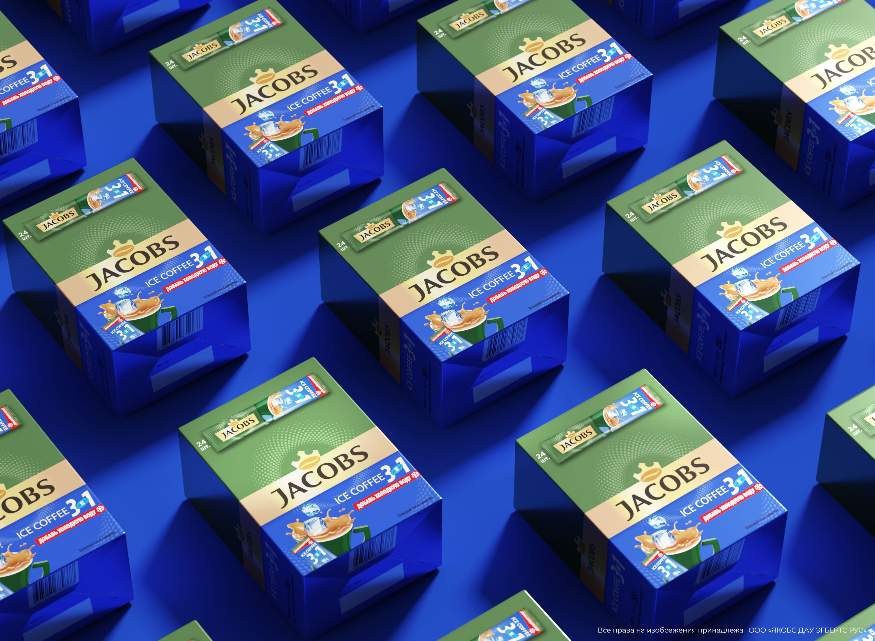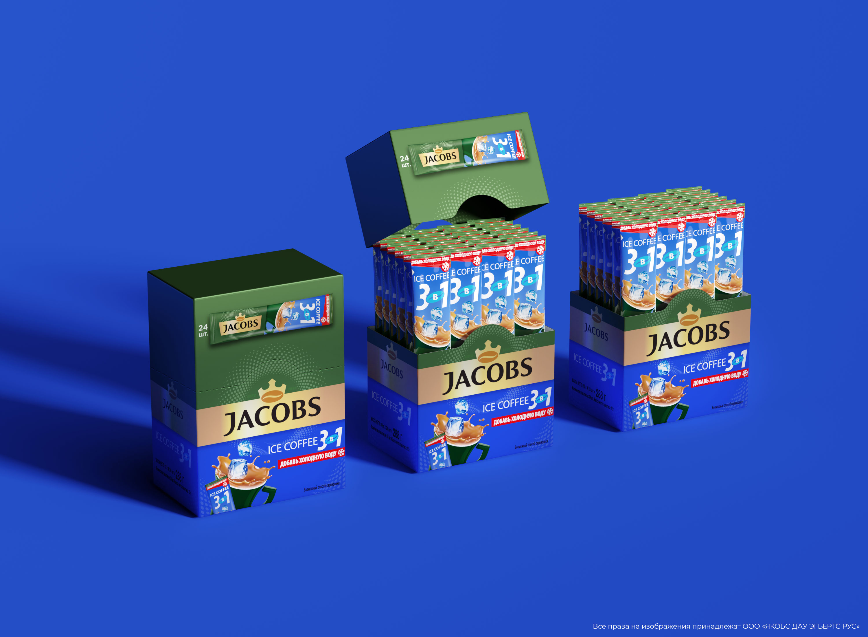 В результате получился яркий, считываемый дизайн упаковки Jacobs Ice Coffee 3в1, сохраняющий преемственность бренда.