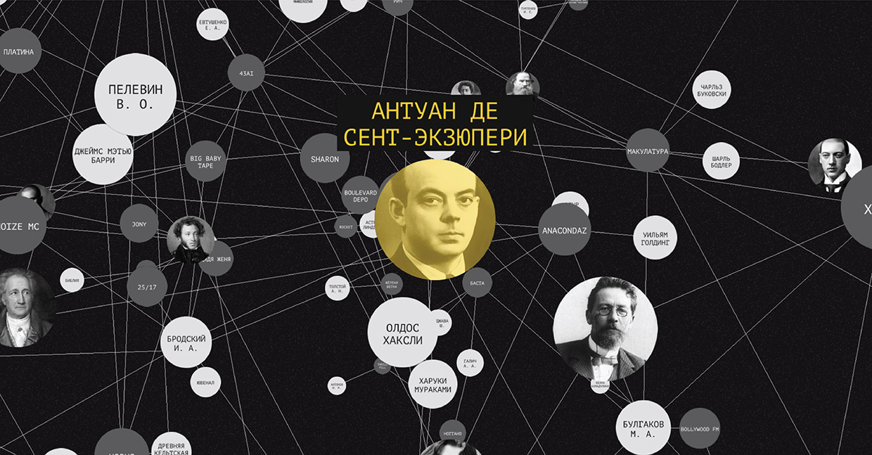 Таким образом получилось проанализировать треки популярных рэп-исполнителей и наглядно отобразить литературные отсылки в их хитах. Например, Big Baby Tape заимствует строки у Бродского, ЛСП отсылает к Пушкину и Экзюпери, а Хаски и ATL — к Пелевину.