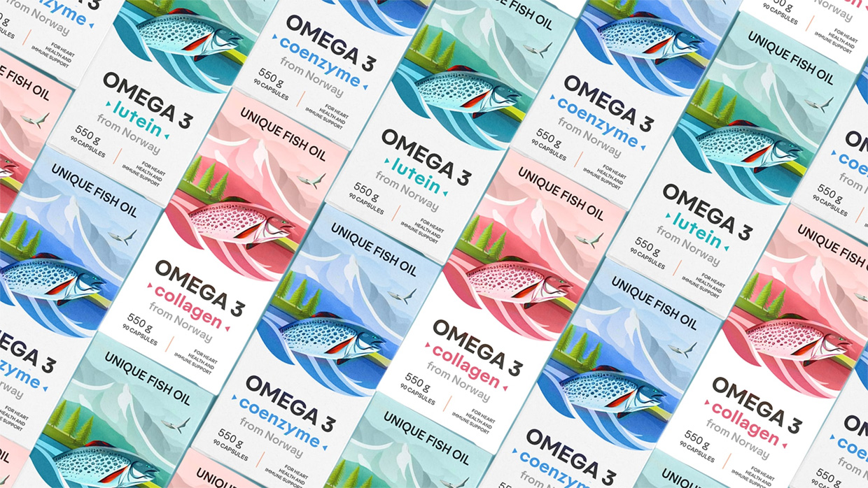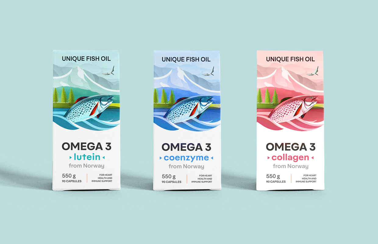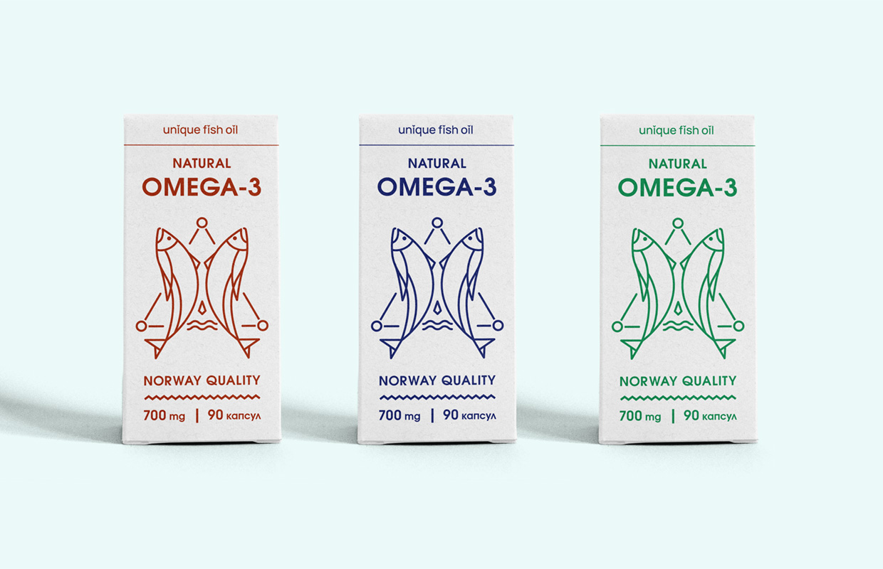 Компания «Вертекс» проводила редизайн существующей упаковки для капсул омега-3. Этот проект мы также включили в процесс соревнования. Из вводных: натуральное сырье в виде лосося, норвежское происхождение, выделить на полке.