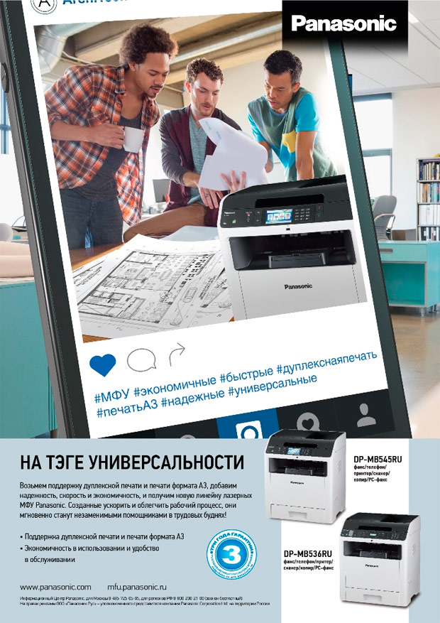 Реклама выдержана в деловом стиле и в то же время, ее героями выступают молодые, креативные люди, умеющие работать в команде и ценящие в работе качество и скорость. Макет выполнен в виде экрана мобильного устройства с отображением страницы одной из популярных соцсетей. Примечательно, что характеристики и преимущества МФУ изображены в виде хештегов.