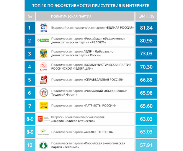 По итогам оценки, средний показатель ЭИП для партий, присутствующих в Сети, составляет 49,08%. Это означает, что сайты менее чем на половину соответствуют современным требованиям. У девятнадцати политических партий сайты отсутствуют вообще.«По сравнению с декабрем 2015 года серьезных изменений в первой десятке не произошло. «Единая Россия» и «Яблоко» значительно улучшили собственные интернет-представительства и продолжают занимать первое и второе места. Всероссийская политическая партия «Родина» покинула десятку, а «Партия Великое отечество», наоборот, попала в число лидеров.