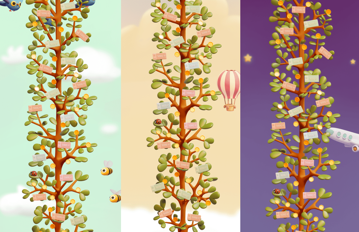 Дизайн решение хотелось максимально приятное и неплоское, 3D — чтобы подчеркнуть объем и рост нашего виртуального дерева. Хотя цвета много, все оттенки мягкие, а формы округлые.