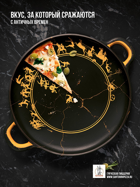 Агентство TBWA\Moscow разработало для греческой пиццерии «Санторини» принт, подчеркивающий исторические корни пиццы, а также слоган «Вкус, за который сражаются с античных времен».«У этого блюда богатое прошлое, невероятная история. Поэтому мы взяли за основу образец классической греческой культуры и по-новому обыграли его» Максим Колышев, креативный директор TBWA\Moscow.