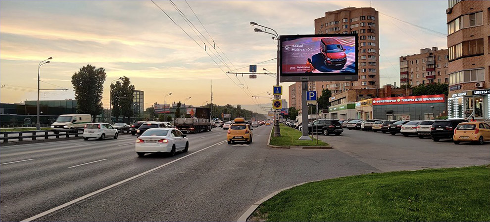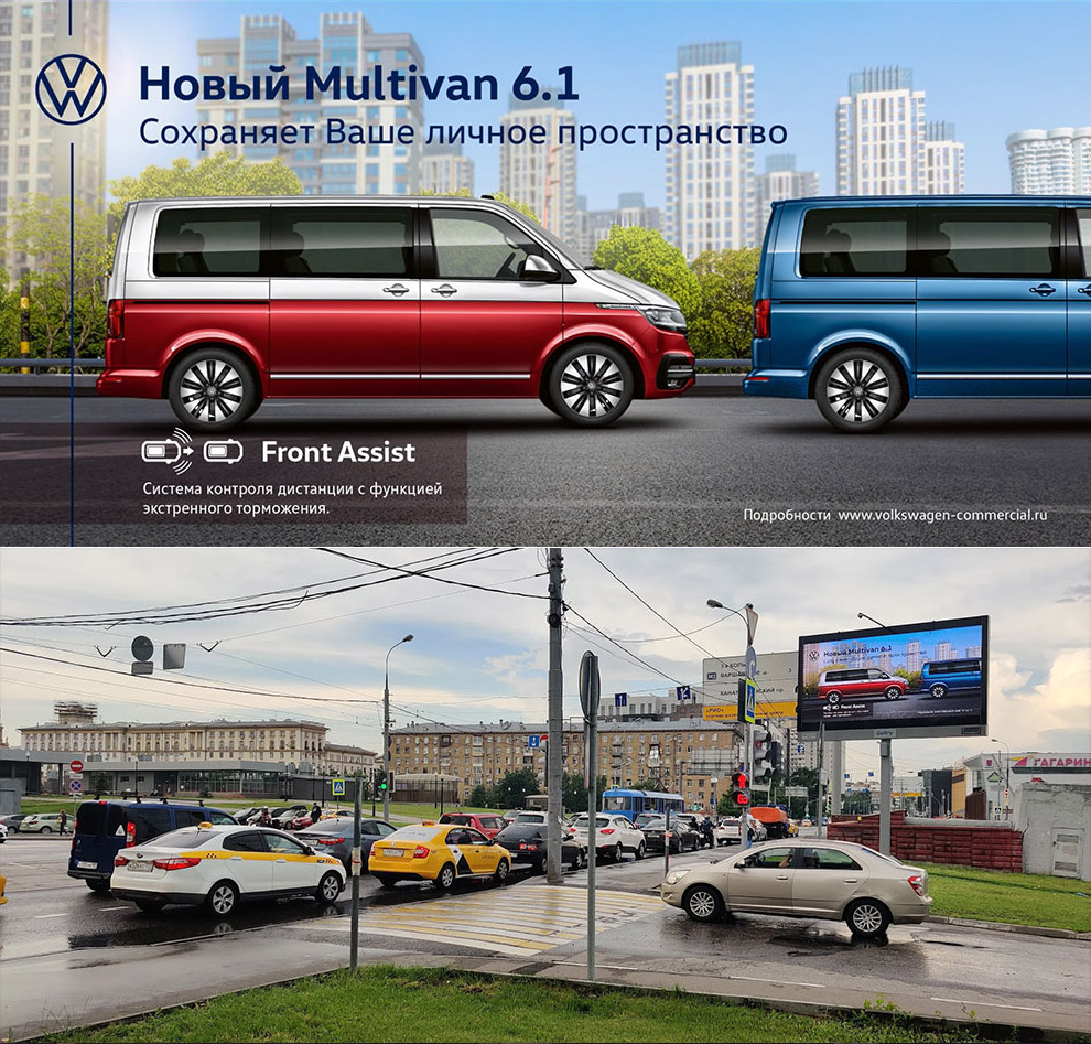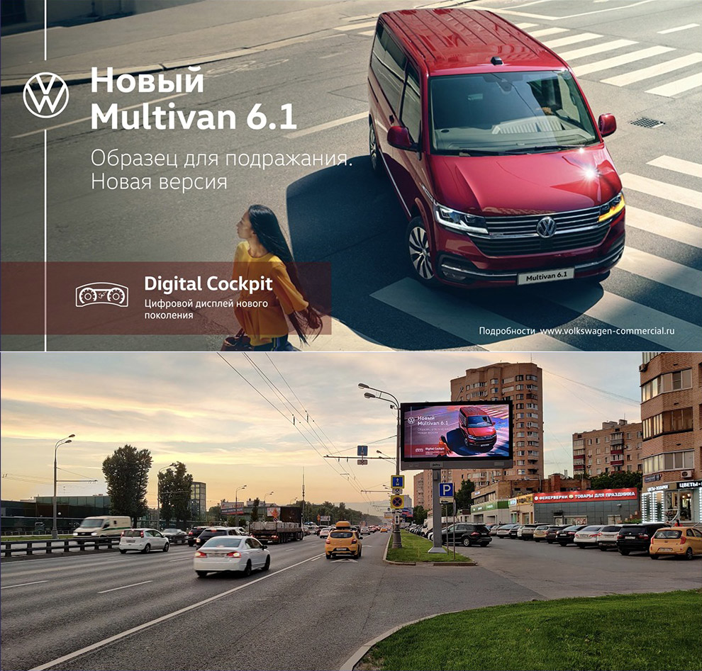 Марка Volkswagen «Коммерческие автомобили» не первый год использует Programmatic DOOH для рекламной коммуникации, и в 2020 году для акцентирования внимания целевой аудитории на USP обновленной модели было решено использовать новые возможности этого медиаканала.
